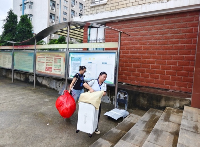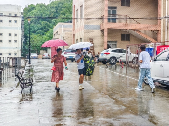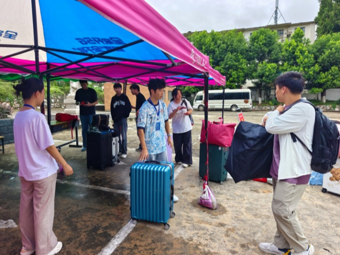 校园内,教职工与志愿者们穿梭于雨幕之中,积极疏导车辆进出,确保交通畅通无阻。在学校入口的醒目位置,学校还特设了行李寄存处与志愿者接待点。志愿者们主动上前,在带领新生前往报到大厅之余,还主动接过沉重的行李,护送新生前往宿舍。