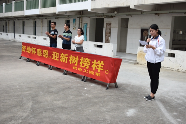 为了形成良好的资助育人环境,教育和引导广大学生“笃学尚行、砺志创新、受助思源、传递爱心”,加强对学生的思想教育,9月5日下午,机电系在二栋宿舍楼前举行了“资助怀感恩,迎新树榜样”主题活动,系团总支书记、专职辅导员及百余名受资助的学生参加了此次活动。