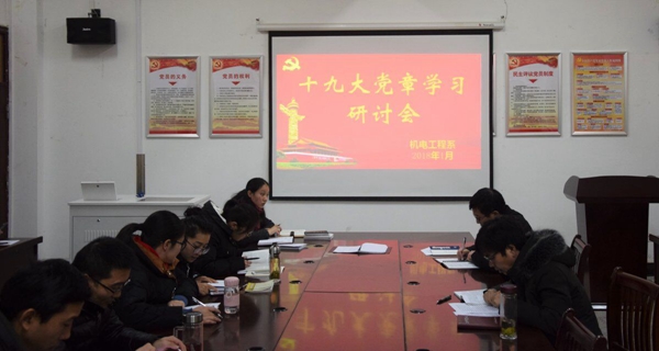 1月12日下午,机电工程系党总支在一栋教学楼208会议室召开十九大党章学习研讨会。在前期学习领会党的十九大精神及党章的基础上,进一步交流和研讨党的十九大通过的《中国共产党章程(修正案)》。系负责人刘磊主持会议并讲话,机电工程系全体教工党员参加了学习研讨。
