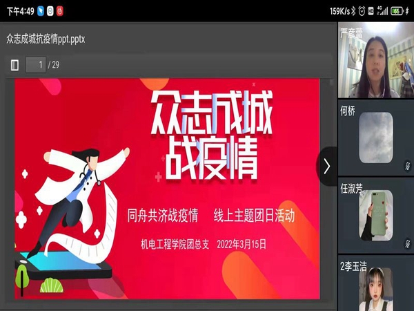 为进一步做好疫情防控期间学生思想政治教育工作,加强对学生心理疏导和健康教育,使我院学子在疫情期间保持乐观积极心态和良好身体素质,机电工程学院团总支组织基层团支部开展形式多样的疫情防控教育、主题团日活动和文体锻炼,大家同心抗疫,坚决守牢校园疫情防控安全防线网,为同学们在疫情期间的身心健康保驾护航。