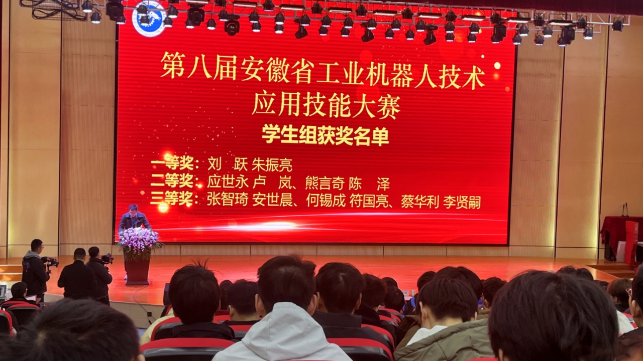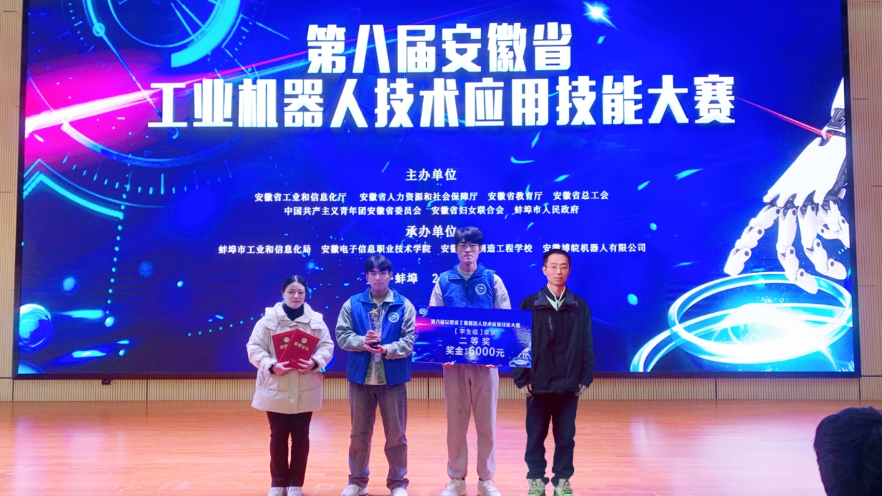 11月28日,由安徽省经济和信息化厅、安徽省人力资源和社会保障厅、安徽省教育厅、安徽省总工会、共青团安徽省委员会、安徽省妇女联合会、蚌埠市人民政府联合主办的第八届安徽省工业机器人技术应用技能大赛在蚌埠市安徽电子信息职业技术学院圆满落幕。伟德官网机电工程学院工业机器人技术专业学生应世永和卢岚组成的团队,在指导老师姚兆凤和陈祺的悉心指导下,凭借出色的专业技能和团队协作精神,荣获大赛第二名(二等奖)的优异成绩。