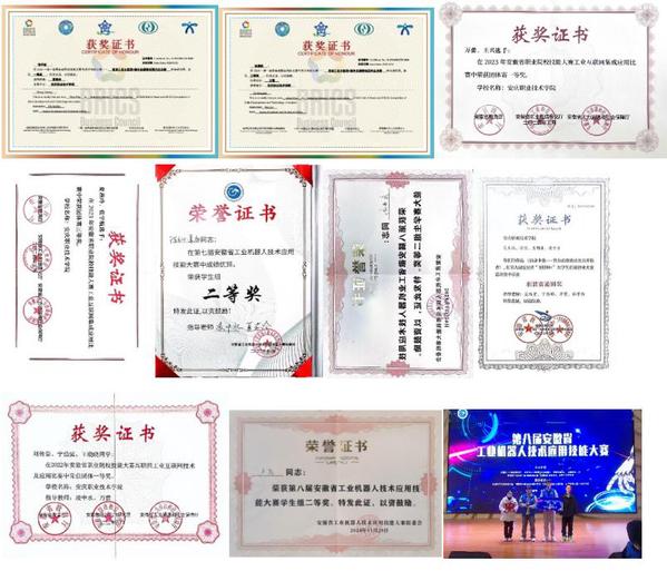 专业优势 工业机器人团队现有专兼职教师共23人,其中专职教师12人,兼职教师11人,专兼教师比达1:1。专职教师中双师素质教师10人,硕士及以上学位教师9人,高级职称2人,博士1人。师资队伍中有安徽省技术领军人才1人,安徽省技术能手1人,安徽省巾帼建功标兵1人,安庆市青年岗位能手2人。团队教师积极提升自己的教学能力以及技能水平,2024年获得安徽省教学能力大赛一等奖、二等奖各一项,获得第五、六届安徽省工业机器人技术应用大赛分别获得教师组一等奖1项、二等奖1项,获得2023年安徽省职业院校技能大赛师生团体大赛一等奖1项、三等奖1项,获得2024年安徽省职业院校技能大赛师生团体大赛二等奖2项。 实训基地: 拥有电工电子技术实训室传感器实训基地、智能制实训基地、液压与气压系统实训基地、自动化生产线实训基地、工业机器人虚拟仿真实训基地、单片机实训基地、工业机器人综合实训基地、 工业机器人应用编程1+X考核实训基地、工业机器人运维操作实训基地等校内实训基地以及6处校企合作实训基地。 学生成果:近年来学生工业机器人技术专业获得省级以及国家级各类大赛奖项; 1、23级工业机器人技术专业张宇航、徐晟凯分别获得2024一带一路暨金砖国家技能发展与技术创新大赛—首届工业互联网+绿色低碳赛项国内总决赛一等奖和三等奖; 2、23级工业机器人技术专业徐晟凯分别获得2024一带一路暨金砖国家技能发展与技术创新大赛—首届工业互联网+绿色低碳赛项国内总决赛三等奖; 3、22级工业机器人技术专业应世永、卢岚获得安徽省第八届工业机器技术应用技能大赛二等奖; 4、21级工业机器人技术专业陈立心、姜旭获得安徽省第七届工业机器技术应用技能大赛二等奖; 5、工业机器人技术团队老师与23级徐晟凯以及张宇航同学参加2024年安徽省职业技能大赛高职组工业互联网技术级应用比赛荣获师生赛道团体均获二等奖; 6、工业机器人技术团队老师与22级王兴同学、以及23级张宇航同学参加2023年安徽省职业技能大赛高职组工业互联网技术级应用比赛荣获师生赛道团体一等奖; 7、21级工业机器人技术专业刘传豪、宁强强、王晓晓参加2022年安徽省职业技能大赛高职组工业互联网技术级应用比赛荣获团体一等奖; 8、22级工业机器人技术专业学生吴玉凯、徐旺、王明壮、谢子童的作品《自动卡盘—省立高效机床夹具开拓者》,在第九届安徽省互联网+大学生创新创业大赛总决赛荣获职教赛道铜奖等。