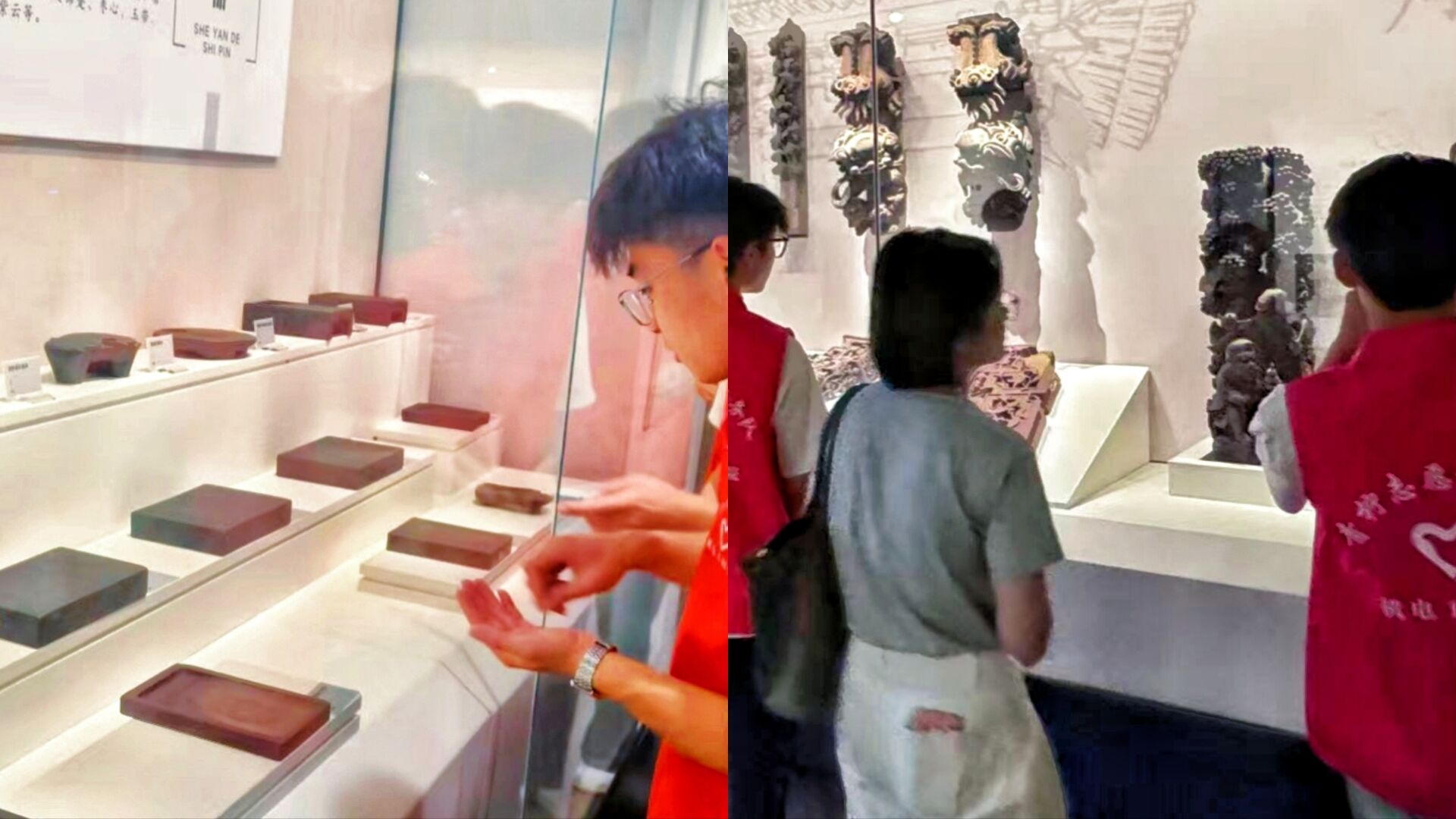7月20日,两项目成员首先参观了徽州历史博物馆,从古朴的徽州古建筑模型到精美的文房四宝,从历代名人字画到民俗文物,成员们悉心聆听讲解,不时驻足记录。此次参观旨在系统增进对徽州文化的理解,梳理剪纸、歙砚等传统技艺的历史渊源,为后续深入探访非遗传承打下坚实的文化认知基础,使实践活动更具深度与温度。
