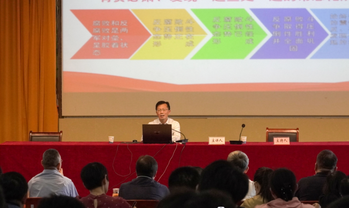 潘忠苗以《严守纪律规矩 全力推进党风廉政建设走深走实》为题,立足当前形势,以身边和教育系统典型案例为镜鉴,提醒大家以案示警、以案为戒、以案促改,要切实增强党风廉政建设和反腐败斗争的责任感、紧迫感,坚持不懈纠“四风”树新风,全力以赴服务发展大局,具有很强的针对性和指导性。潘忠苗强调,作为新时代高校的党员和干部,一定要树立正确的世界观人生观价值观,加强思想淬炼、政治历练,将严守政治纪律和政治规矩作为安身立命的“压舱石”。要不断提升履职本领,担当尽责干事。要着力清除“不想为”的思想惰性,克服“不敢为”的畏难情绪,补齐“不能为”的能力短板,少说空话、多干实事,源源不断为各行各业培养高素质的产业生力军。