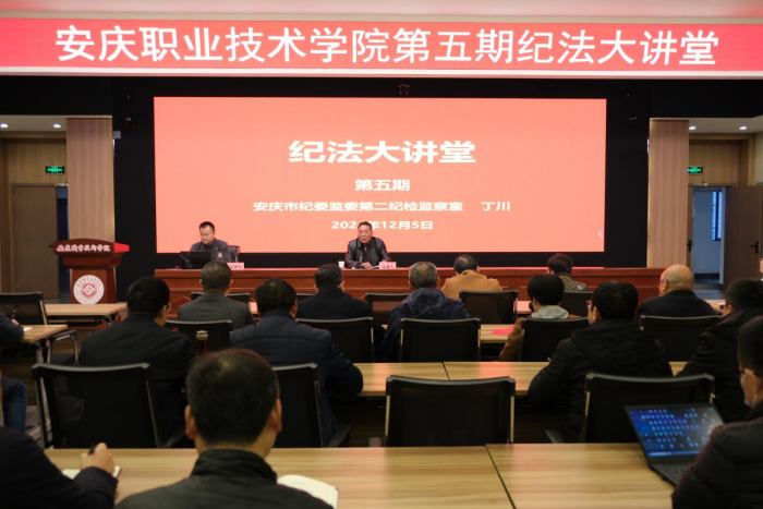 为巩固深化党纪学习教育成果,推进全面从严治党治教,12月5日下午,校纪委在图文信息中心三楼报告厅举办第五期“纪法大讲堂”。本次活动邀请了市纪委监委第二纪检监察室负责人丁川同志作专题报告,校党委委员、纪委书记陈继平主持本次活动,校领导、副科级及以上干部、专职辅导员及学生干部代表共140余人参加。