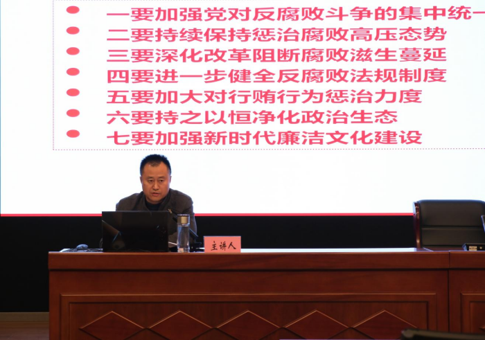 丁川以“持续自我革命,纵深推进全面从严治党”为主题,深入分析了当前党风廉政建设和反腐败斗争的形势,结合身边的典型案例生动阐述了党员领导干部要树立正确的权力观、政绩观、事业观,正确处理好党性与个性、显绩与潜绩、权力与责任、干净与干事的关系。