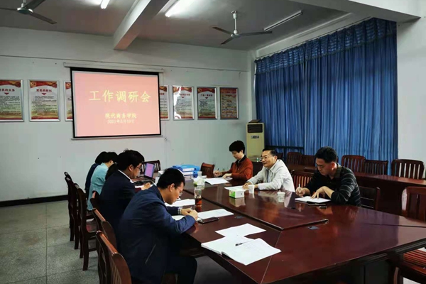 会前,我院就此次调研工作做了充分准备。会上,高飞院长代表现代商务学院向校领导就二级学院管理职能的划分、党建工作、党史学习和教学检查四个方面进行了汇报,各部门相关负责人做了补充性发言,表示在校领导的关心和大力支持下,我院各方面工作扎实推进、进展有序。