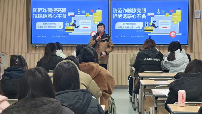 为进一步做好学校防范电信网络诈骗工作,构建和谐平安校园,切实做好电信网络诈骗的防范教育,有效提高学生识骗防骗的意识和能力,保障学生的财产安全。根据学校《关于开展反诈宣传月活动的通知》要求,12月18日,现代商务学院24级大数据与会计一班组织开展“防范诈骗擦亮眼,拒绝诱惑心不贪”为主题的反诈主题班会。