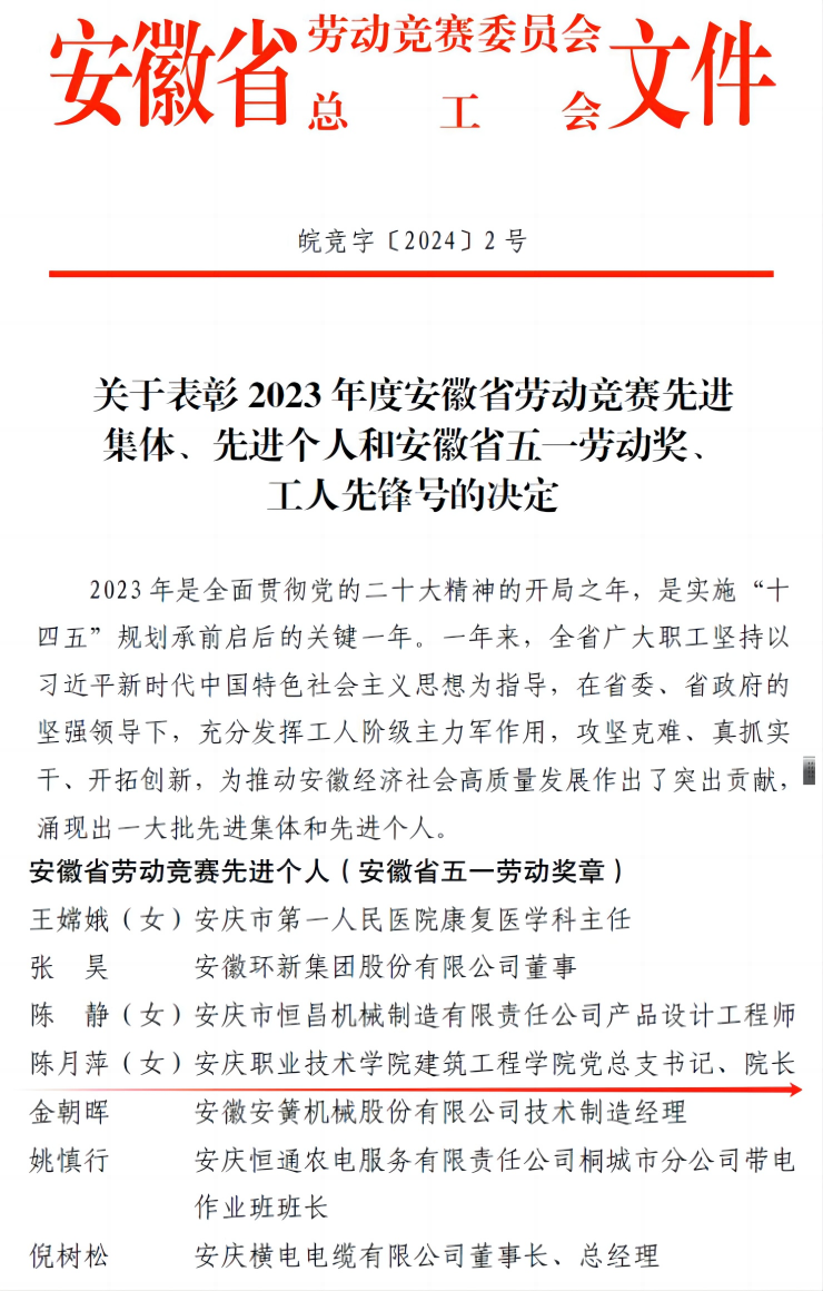 伟德国际英国陈月萍教授获“安徽省五一劳动奖章”