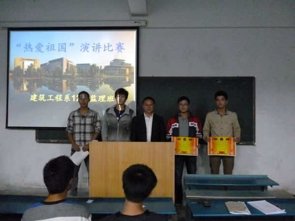 为切实提高同学们的演讲水平,增强同学们的自信心,12级监理(1)班于2013年10月20日晚上举行“热爱祖国,热爱生活”为主题的演讲比赛。
