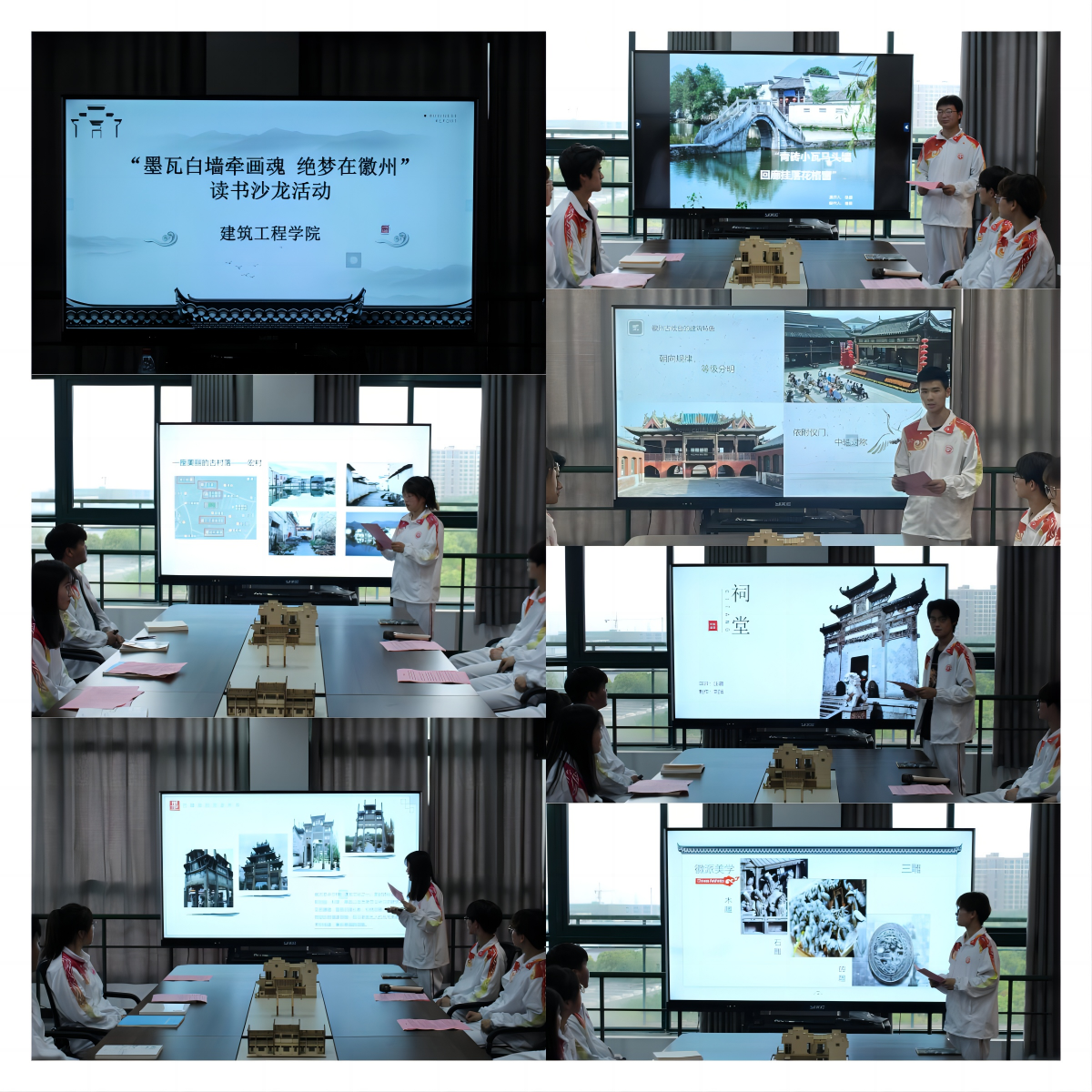 22级装饰三班的姜思雨给大家解析了徽州从何而来、徽风文化的起源、徽商的鼎盛时期从而引出了中国六大古建筑之一的徽派建筑历史渊源。21级造价二班的王新婷给大家分享了具有徽派特色的皖南徽州古建三绝:古民居、古祠堂、古牌坊,分别从他们的历史作用、建筑构造特色带领大家领略“世界遗产名录”的独特魅力。22级市政二班的潘兴给大家展示了“乌瓦白砖马头墙,无一古宅不雕花”的徽州“三雕”(木雕、石雕、砖雕),风格不同又一脉相承,每一处花纹、每一笔雕刻展现出能工巧匠施尽其技。在读书沙龙中同学们看的是岁月点染的粉墙黛瓦,讲的是对历史回顾后的沉思,倾听的是徽州历史的余音,传播的是古韵徽州的文化名片。