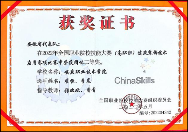 2022年因为疫情原因比赛一直推迟,比赛时间不确定,导致他们心态有所变化,直到国赛时间确定,他们稳住心态放弃五一假期和暑假,不惧酷暑,每天坚持训练十小时。功夫不负有心人,在2022年的全国职业院校技能大赛建筑装饰技术应用赛项中荣获了团体二等奖以及安徽省职业院校技能大赛《建筑装饰技术应用赛项》、《精细木工赛项》团体赛一等奖,最终他们站在了比赛的领奖台上。