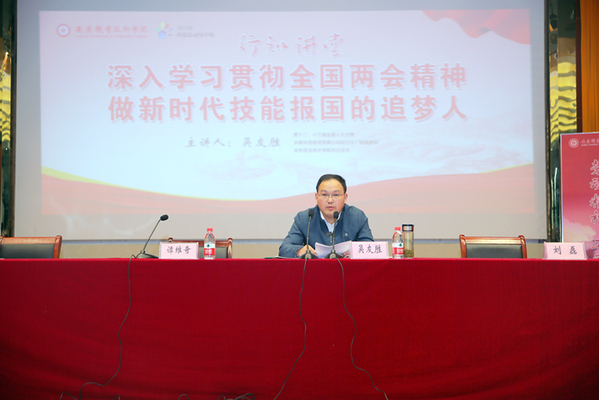 为深入学习习近平总书记关于职业教育重要指示批示精神,大力宣传贯彻新修订的《职业教育法》,5月11日下午,校科协“行知讲堂”特邀全国人大代表、华茂集团优秀员工、伟德官网杰出校友吴友胜同志到校作职教活动周专场报告。党委委员、副校长、校科协主席谭维奇教授和党委委员、宣传部部长吴何珍教授出席报告会。机电工程学院院长、校科协副主席刘磊教授主持报告会。