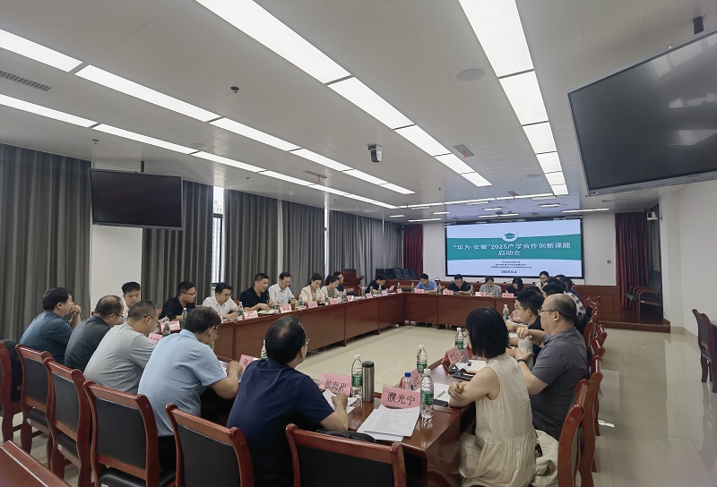 6月4日下午,安徽省职业教育与产业发展研究中心在安徽工商职业学院召开“华为·安徽”2025产学合作创新课题启动会。安徽工商职业学院党委委员、副院长陈章奇,安徽省教育厅高教处一级主任科员任雯君,华为安徽政企教育行业代表李秋铭,华为安徽政企教育解决方案专家李洪臣,以及安徽省职业院校现代产业学院管理办公室、安徽省职业教育与产业发展研究中心相关负责同志出席会议。安徽职业技术学院、芜湖职业技术学院等9所高职院校11位课题负责人和部分团队成员参加会议。会议由陈章奇主持。