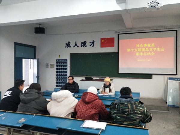 1月11日中午,社会事业系团总支学生会在3号教学楼217教室召开期末总结会。系团总支书记汪江红老师、副书记赵力老师及团总支学生会主要学生干部参加会议。