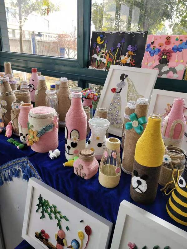 作品展由“手工衍纸”“超轻黏土”“玻璃瓶的废物利用”三大部分组成。展品琳琅满目。一件件作品外观静美,做工细腻,创意独到。作品背后的童年故事展开了一幅幅动人的画卷,废物利用,“变废为宝”更是一种很好的环境保护宣传方式。展览现场,相关创作者积极向参观师生介绍作品主题和创作灵感来源。温馨的家、公主的王冠、盛开的鲜花、幸福的新娘等等,每一份作品都寄托着一份情感,隐藏着一个梦想。同学们灵动的构思和精巧的呈现让现场师生赞叹不已。