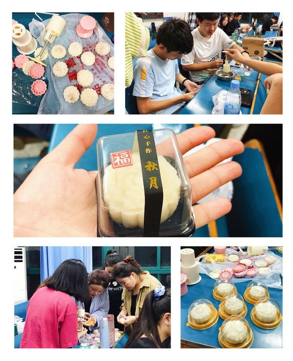 从9月28日晚开始,该系以班级为单位分别在教室和食堂开展了“巧手做月饼·品月话家常”活动。“20克面皮、50克馅料,将面皮搓圆后摊平……”,同学们围在一起认真对照微博教学视频中糕点师傅的讲解,学习亲手制作月饼,不一会儿,一个个精美的月饼在大家手中成型,精致美丽。在食堂师傅们的帮助下,同学们将制作好的月饼进行加工加热,互相品尝。