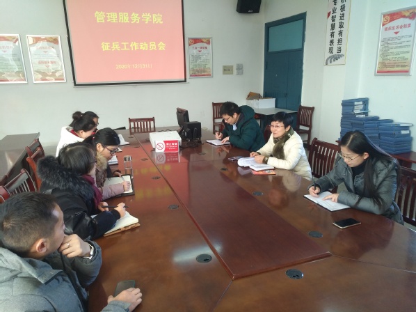 2020年12月31日中午12:00,管理服务学院在3号教学楼314会议室召开2021年春季征兵工作动员会。会议由院长高润霞主持。学生管理科、团总支和相关辅导员班主任参加会议。