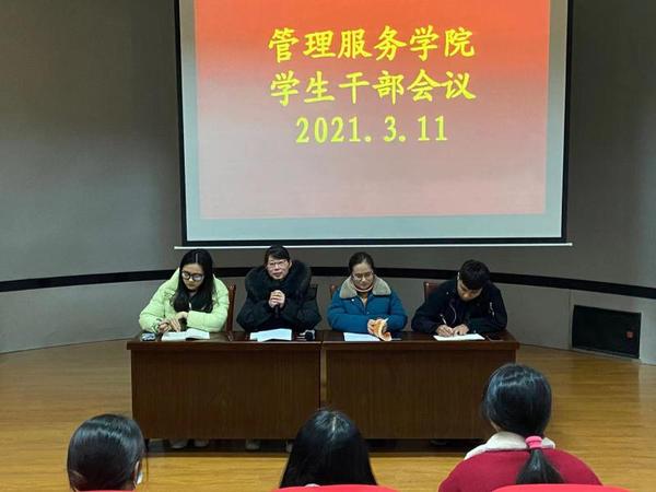 为促进新学期团学工作的有序开展,3月11日下午,管理服务学院召开了新学期第一次学生干部会议。院党总支副书记丁凡出席会议,全体学生会干部和各班级主要班干参加会议,会议由团总支副书记汪婷主持。