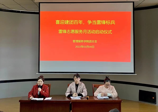 为进一步弘扬雷锋精神,宣传“奉献、友爱、互助、进步”志愿服务理念,3月4日,管理服务学院在三号教学楼216教室举行了“喜迎建团百年,争当雷锋标兵”雷锋志愿服务月活动启动仪式。院党总支副书记丁凡、学生管理科科长汪婷、团总支书记梁妞及学生干部和各班团员代表参加了启动仪式。