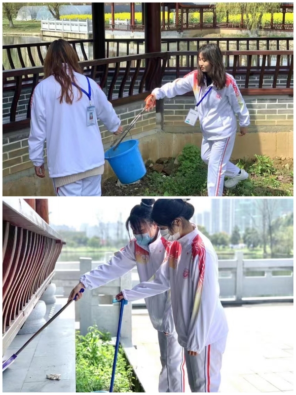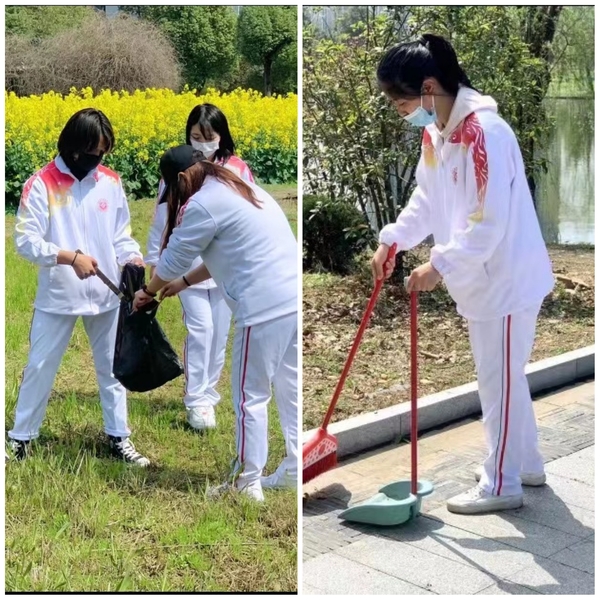 启动仪式结束后,志愿者们在校园清扫垃圾,以饱满的热情和坚定的行动迎接团的百年华诞。