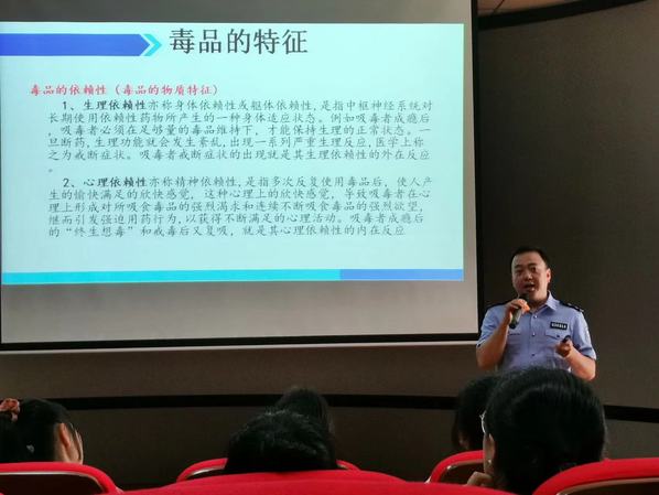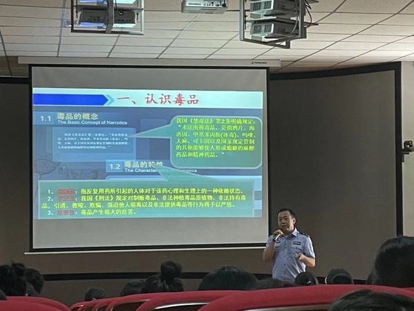 6月17日下午,为进一步做好校园禁毒宣传工作,提高学生识毒、防毒、拒毒意识,在校园内营造人人参与禁毒活动的良好氛围,管理服务学院特邀安庆市禁毒委员会主任、市公安局禁毒支队二大队队长王峻峰做题为《青少年与合成毒品》的禁毒专题讲座,全院共100多名学生代表聆听讲座。王主任从认识毒品、预防毒品、禁毒法律法规等方面,同时结合自身所办理的一些典型案件,生动形象地介绍了毒品的严重危害,并教同学们如何识别毒品和吸毒人员的各种方法,尤其是女同学在外如何保护自己。王主任的讲座让同学们进一步加深了对毒品的认识,有助于同学们树立自觉远离毒品、抵制毒品的意识。