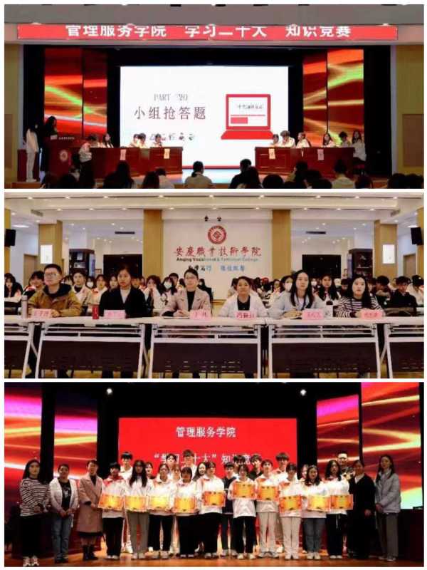 为不断拓展学习党的二十大精神的广度和深度,提升学习效果,管理服务学院团总支在婴幼儿托育服务与管理专业实训楼报告厅举办了“学习党的二十大·永远跟党走”知识竞赛。本次知识竞赛分为预赛、决赛两个环节,我院学生展现出了较高的参赛热情。预赛阶段,各班学生代表300余人参加了笔试,最终选出了四支代表队12人参与现场决赛。决赛现场,围绕党的二十大精神和报告内容、党史知识,分必答题、抢答题、风险抢答题和附加题四个环节。各参赛小组精神饱满、团结协作,以精彩的表现赢得了在场师生的阵阵掌声。