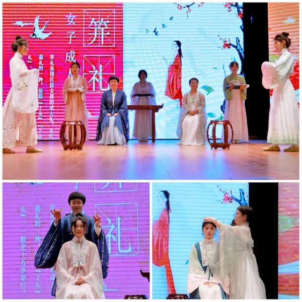活动在美轮美奂的古风舞蹈《苏幕遮》中拉开序幕。活动中展示了揖礼、冠礼和笄礼。揖礼分为天揖礼、土揖礼与时揖礼。天揖礼表达对长辈和老师的礼敬,传承尊师重教的传统美德;土揖礼是老师对学生的回礼;时揖礼是平辈之间的行礼。冠礼和笄礼是成人礼,是给跨入成年人行列的男子加冠、女子配笄的礼仪。特邀嘉宾高润霞、朱宜娟换上汉服,为女生代表配笄。她们的优雅端庄彰显了个人内在修养与女性魅力,赢得了现场热烈的掌声。何世亮老师和何旺老师为男生代表加冠,希望青年学生能够勇担大任,寓意深远。