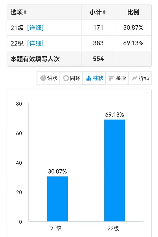 3月22日-3月26日,管理服务学院利用问卷星平台组织开展实验室安全知识竞赛,我院2021级、2022级学生共586人参与本次知识竞赛,回收有效问卷554份,其中90分以上人数为278人,优秀率为50.18%。