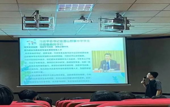 在学生干部培训会上,团总支副书记练思雨表示,国家安宁,才能安放下安静的书桌;国家强大,才能护佑万千小家!“立地顶天期救国,开来继往志坚强。”国防教育,一头连着家国,一头连着书桌。手缚长缨少年志,戎装不负家国情。看了习近平总书记回信勉励潜山野寨中学新考取军校的同学们,倍感鼓舞,我们更应该以身示范,积极带头响应,将“爱国主义”扎根在自己的信念中。