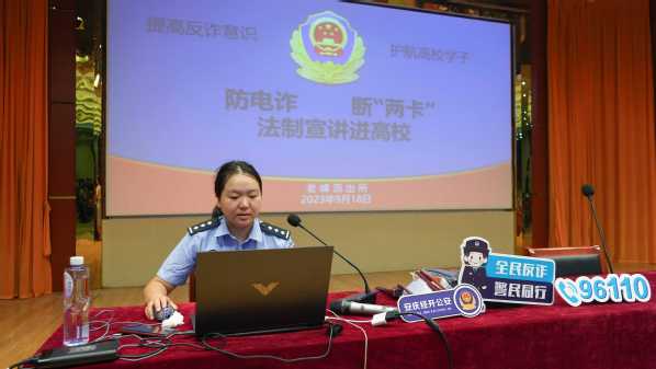 活动现场,老峰派出所葛辉警官以“防电诈、断‘两卡’法制宣传进高校为主题,通过典型案例讲解、精准的数据分析,深入浅出地介绍了电信诈骗的常见形式、惯用套路以及防范措施。同时对于公安部的专项行动“断卡”行动和帮信罪进行了详细地解读。讲座过程中,为了增强反诈宣传效果, 葛警官还与同学们进行了互动,现场气氛活跃。她从高校青年的特点出发,再次提醒大家提高警惕,增强防范意识,护好钱袋子。