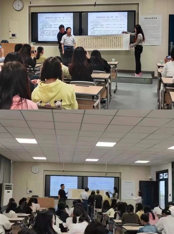 讲座中,陈祥明从观看与书写之间的关系出发,为同学们介绍了如何欣赏书法,写好书法的技巧,如何从写字进步到书法,以及他对书法艺术的深度理解。整场讲座,陈祥明以他广博的学识、精深的书法理论以及通俗易懂的语言,精彩阐述了书法的欣赏与文化传播,同时还向师生展示了名家的书法作品,令大家对书法有了更全面深入的理解和认识,受益匪浅。
