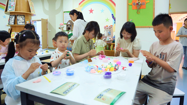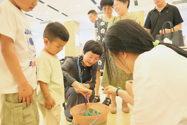 本次亲子活动内容丰富多样,有幼儿舞蹈、绘本故事、粘土DIY、制作扭扭棒、非遗漆扇制作、亲子竞技、亲子游戏等诸多项目,每个项目结束小朋友都可以在游戏集卡章上盖一个章,最后凭着集满章的卡兑换礼品,趣味活动设置极大地激发了孩子们的积极性。“小朋友,你的动作做得真好”,孩子们在老师的带领下,开心的在舞台上跳舞;“小朋友,你摸摸看......”这是老师在讲绘本,小朋友们被老师惟妙惟肖的表演吸引住了。在黏土和扭扭棒制作环节小朋友们制作出了自己喜欢的小动物造型以及发箍。非遗漆扇制作是最受欢迎的,在家长陪伴下,孩子们选择自己喜欢的颜色,制作出独一无二的漆扇。在亲子游戏中,家长和孩子共同参与,通过“蒙眼找娃”、“反口令”等环节,加强家长和孩子的团结合作。