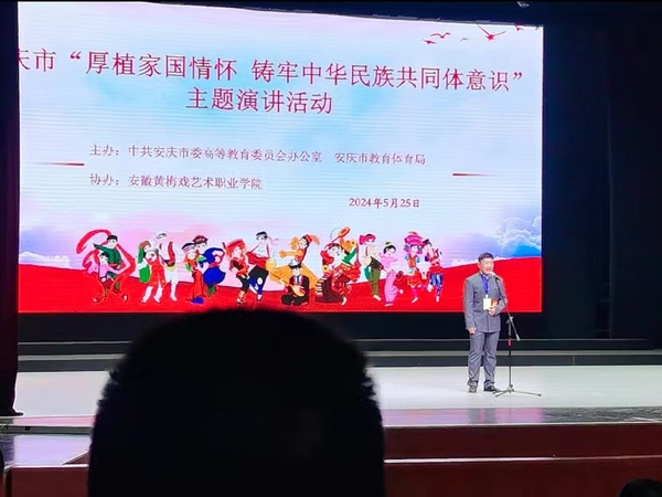 5月25日,由中共安庆市委高等教育委员会办公室与市教体局主办、安徽黄梅戏艺术职业学院协办的“厚植家国情怀铸牢中华民族共同体意识”主题演讲活动在安徽黄梅戏艺术职业学院实验剧场举行,我院2023级旅游管理专业的张磊同学以其精彩表现荣获一等奖。