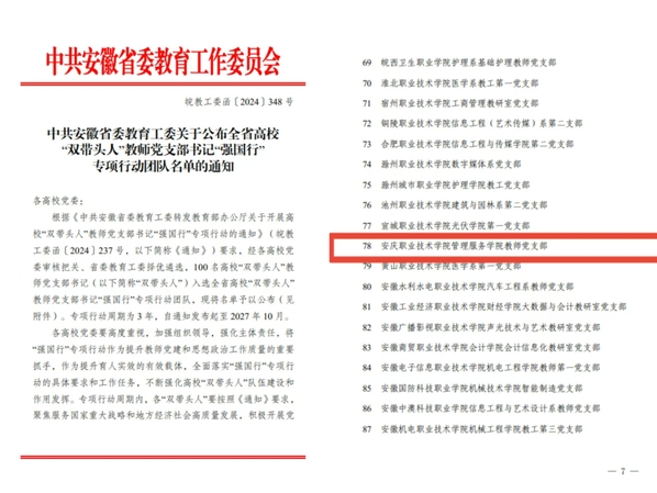 近日,安徽省委教育工委公布了全省高校“双带头人”教师党支部书记“强国行”专项行动团队名单,管理服务学院教师第一党支部成功入选。