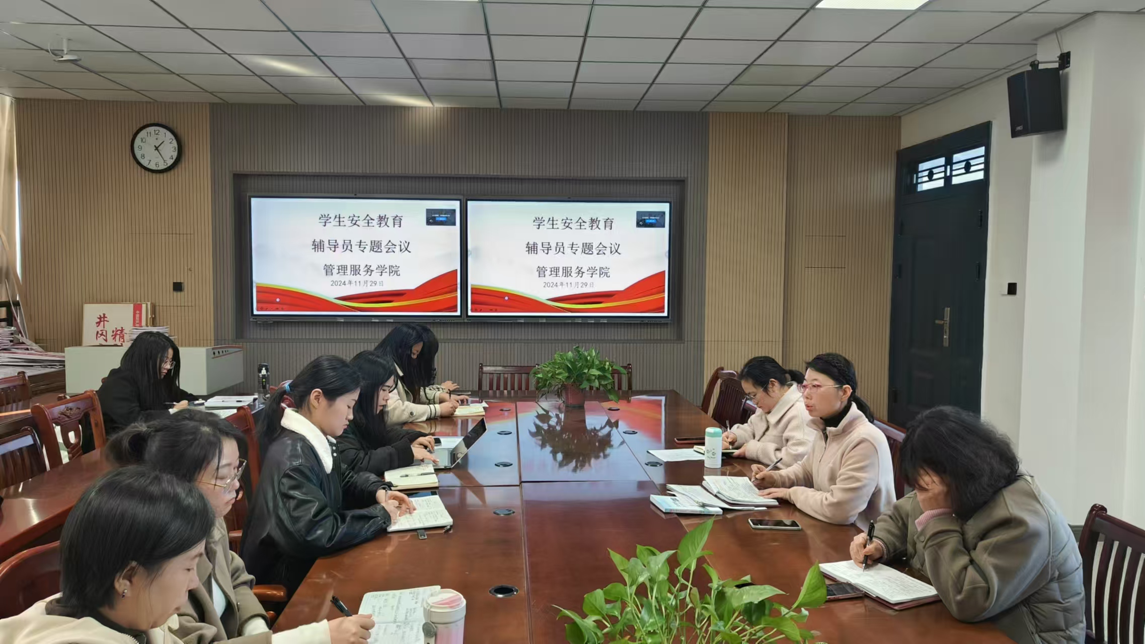 为做好学生安全教育管理工作,管理服务学院召开学生安全工作会议,院学生工作负责人和全体专兼职辅导员参加了会议。会议要求全体学工人时刻绷紧“安全弦”,牢固树立安全第一的观念,重点做到以下几点:一是密切关注学生心理健康,做好家校沟通,建好班级工作台账;二是高度重视意识形态安全、网络安全、交通安全等,让学生增强明辨是非的能力,守护好人身安全和财产安全;三是落实辅导员进宿舍制度,做好宿舍走访与安全检查工作,排查宿舍安全隐患;四是做好毕业生动态跟踪工作,了解毕业生实习就业情况,加强就业指导并引导学生提升安全意识。