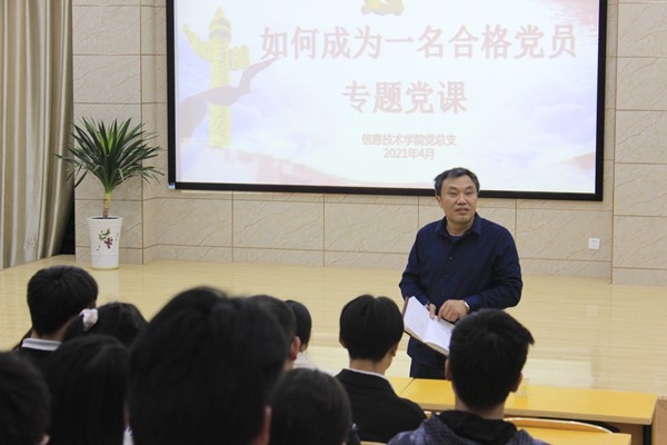 为进一步提高入党积极分子思想政治觉悟,4月21日19:30,信息技术学院党总支在2栋216室开展“如何成为一名合格党员”专题党课学习,党总支副书记程立担任主讲人,2020级入党积极分子参加了学习。