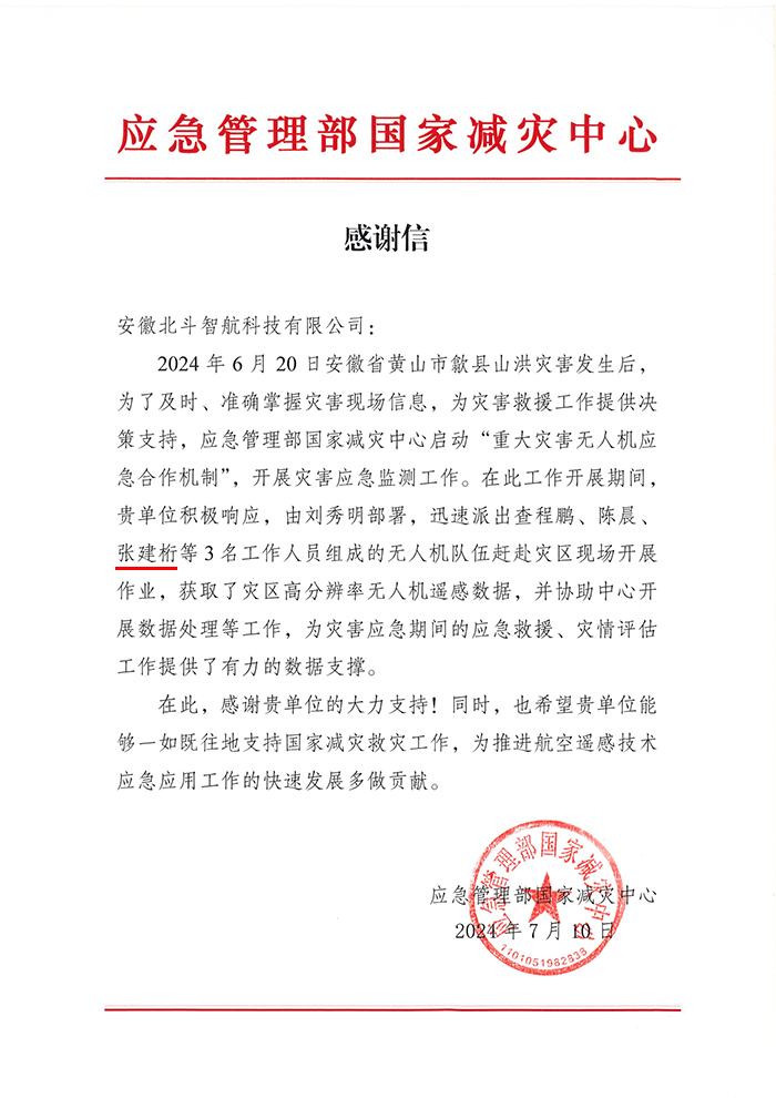 面对突如其来的灾害,应急管理部国家减灾中心迅速启动了“重大灾害无人机应急合作机制”,安徽北斗智航科技有限公司积极响应,5月份入职的张建桁同学主动参与,携带高分辨率遥感设备,通过熟练的专业操作获取了灾区的关键影像数据。这些数据为应急管理部门提供了精准的现场信息,极大地促进了救援工作的精准部署和灾情评估的科学性,为减少灾害损失、保障人民生命财产安全做出了不可替代的贡献。7月10日,应急管理部国家减灾中心致信对张建桁同学及其团队的表现给予了高度评价和感谢。