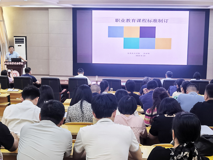 为帮助教师更好地领会和贯彻学校课程标准制(修)订要求,提高2024级课程标准的科学性和规范性,8月29日上午,信息技术学院在2号教学楼信仰报告厅开展了“职业教育课程标准制订”专题培训活动。该院应用电子技术专业建设负责人齐祥明副教授担任主讲,院长疏国会教授出席本次活动,全体教师参加学习,活动由副院长熊祖涛主持。