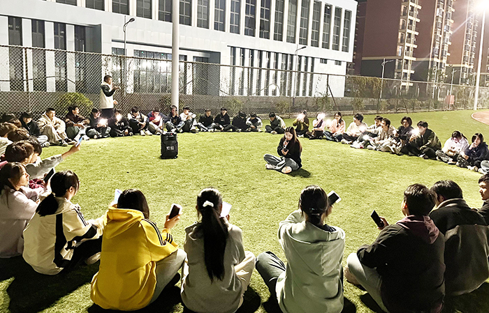 明月高悬,清辉耀眼,2024级同学们环坐在田径场的中央,悦耳动听的歌曲与活力四射的舞蹈为破冰活动拉开了帷幕。简单有趣的小游戏让同学们在欢笑中记住了彼此;在你一言我一语拼凑出的小故事中,同学们思如泉涌,故事内容精彩纷呈,互动环节妙趣横生,氛围热烈。