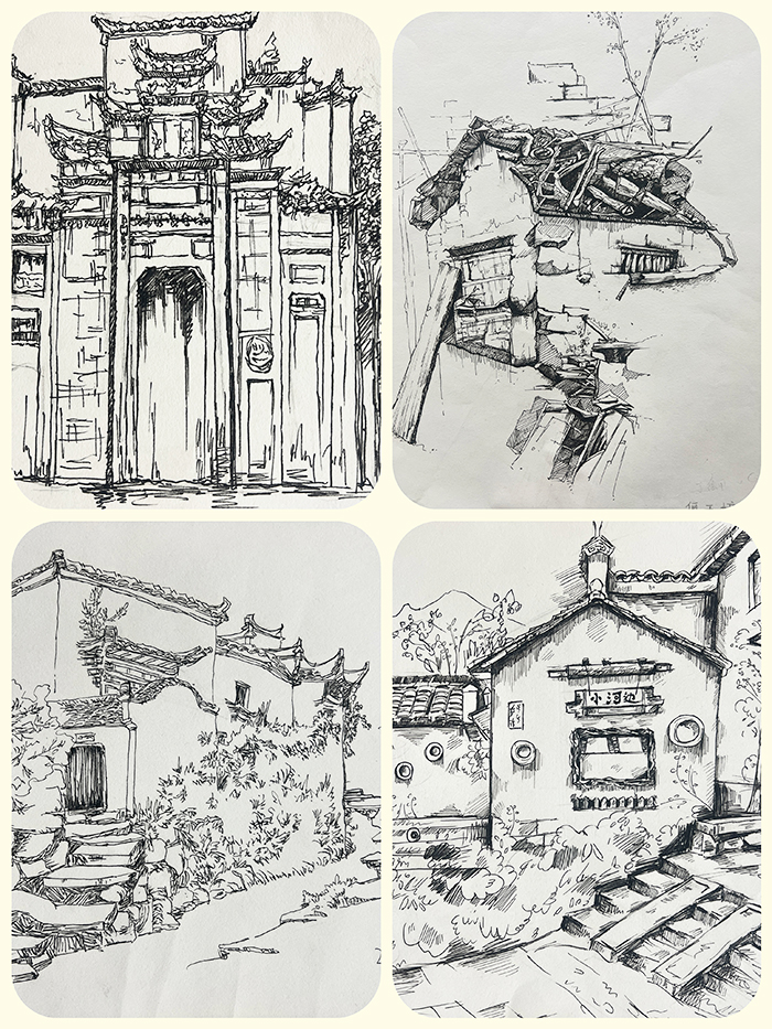 汇报展上,一幅幅充满徽派风情的画作令人目不暇接。学生们以速写的技法,将皖南屏山村的秋日风光与徽派建筑完美捕捉,生动地呈现在观众面前。这些作品不仅展现了秋季皖南的独特魅力,更融入了学生们对大自然的热爱,以及对数字媒体艺术设计的深刻理解和创新思考。