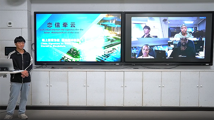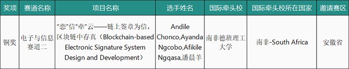 本次参赛队由信息技术学院金鑫和陈小祥老师指导,三名南非德班理工大学学生Andile Chonco、Ayanda Ngcobo、Afikile Ngqasa和伟德官网优秀选手潘晨羊共同组队,以区块链电子签章系统开发为项目内容参赛。该项目来源于该生实际开发的一个区块链电子签章系统项目,系统采用FISCO BCOS作为底层平台,利用区块链技术的去中心化、不可篡改和透明性等特点,确保电子签章的真实性和安全性。该系统实现了电子签章的生成、验证、存储和管理等功能,用户可以通过该系统进行电子文档的签章和验证操作,体现了较高的技术水准和复杂度。