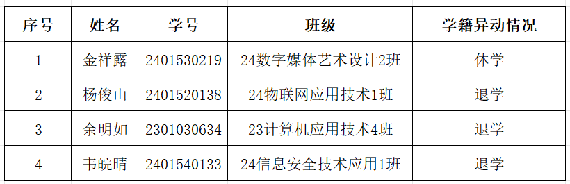 根据《学生资助资金管理办法》(财教〔2021〕310号)的文件精神、按照学校学生资助管理中心相关文件通知要求,因学籍异动原因,经研究决定,取消金祥露等4位同学2024-2025学年度春季学期国家助学金受助资格(具体名单见附件)。现予以公示。