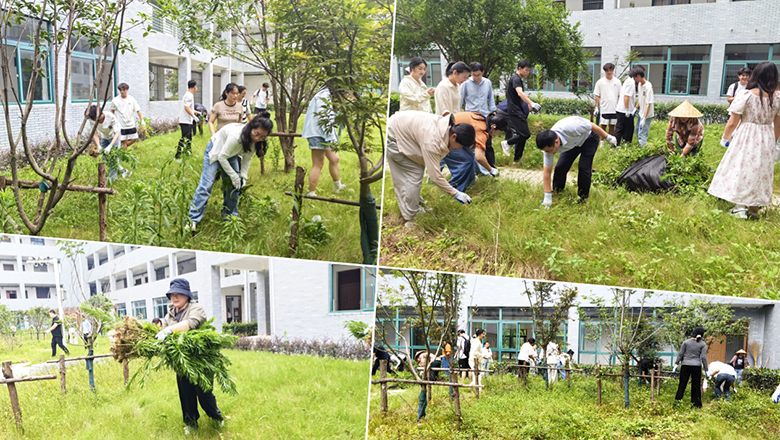 经过近一小时协力奋战,原本杂草滋生的草坪焕然一新。被清理出的杂草杂物堆成小山,整洁开阔的绿地重新展露勃勃生机。这焕新的不仅是环境面貌,更是党员们对“信园”这片育人沃土的深厚情感。