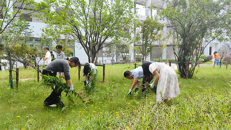 除草现场,党员们胸前的党徽,成为引领行动的鲜明标识。同志们挽起衣袖,教师党员与年轻的学生预备党员并肩协作,分区包干,挥汗如雨。大家俯身于茵茵绿草间,细致辨识并拔除每一株杂草,清理每一处死角。教师们边劳作边向学生预备党员传递劳动经验与实干精神,学生党员则展现出青春活力与不怕脏苦的劲头。泥土沾上裤腿,汗水浸透衣衫,忙碌的身影在信园里诠释了劳动创造美丽的朴素价值。