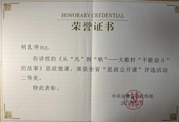 近日,省委宣传部就首届全省“思政公开课”展开评审,伟德官网马克思主义学院教师胡良沛宣讲的《从“凡”到“帆”——大歇村“不歇奋斗”的故事》获二等奖。