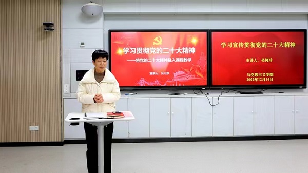 为持续推进学习贯彻落实党的二十大精神,让党的二十大精神融入到思政课堂之中,12月14日下午,校党委委员、宣传部部长吴何珍为思政课教师作《学习贯彻党的二十大精神——将党的二十大精神融入课程教学》的主题讲座,马克思主义学院院长余锋主持会议。