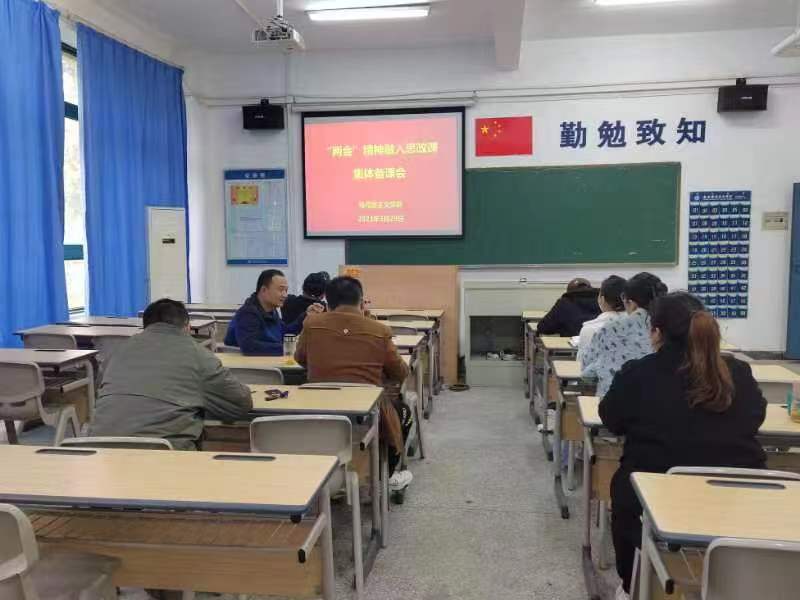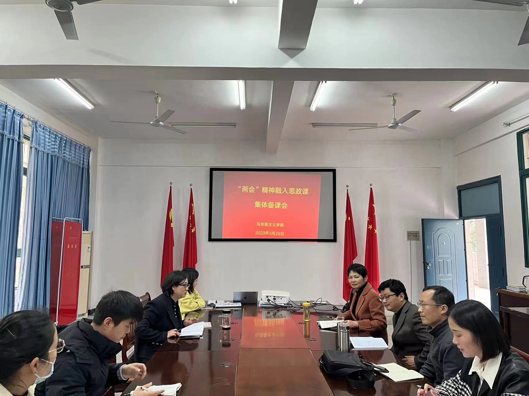 为全面贯彻党的教育方针,落实立德树人的根本任务,重温习近平总书记在学校思想政治理论课教师座谈会的重要讲话精神,持续增强思政课的时效性,马克思主义学院组织《习近平新时代中国特色社会主义思想概论》、《毛泽东思想和中国特色社会主义理论体系概论》等课程组分别召开了两会精神融入思政课集体备课会。全体思政课教师参与集体备课会。