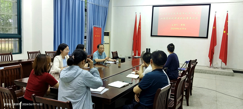 6月19日下午,马克思主义学院在三号教学楼106会议室举行专题学习会,学习党的政治纪律和组织纪律相关内容。马克思主义学院党总支书记余锋主持会议并讲授题为《深入学习<中国共产党纪律处分条例>》的党课,全体党员教师参会。