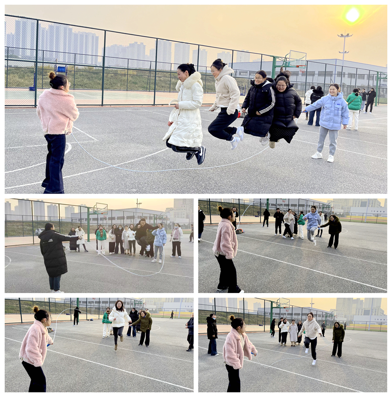 定点投篮规定每位选手投5个球,按进球数多者胜利,参赛老师们纷纷展示了自己的投篮技巧,篮球在空中划过一道道优美的弧线,应声入网。在这场考验力量与技巧的竞赛中,大家展现了超强的决心与韧性,赢得全场阵阵喝彩。“8”字跳绳每组6人,计时3分钟,比赛中绳子停止摇动时,可继续比赛,然后接着连续计数,直至比赛结束。这项运动是体能与耐力的比拼,参赛老师们齐心协力,为了团队的荣誉并肩作战。场上参赛队员竭尽全力、默契十足;场